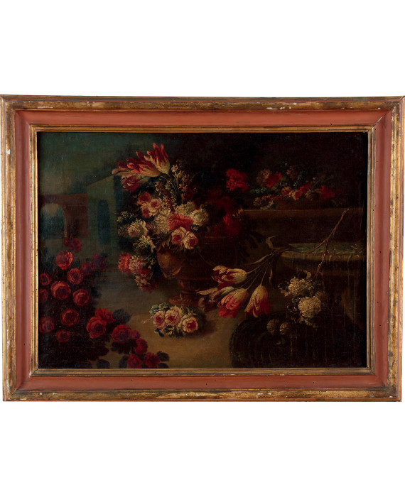 Natura morta di fiori en plein air, con cornice. Francesco Lavagna è uno dei protagonisti della natura morta napoletana di inizio Settecento e la sua formazione, come anche quella di Gaspare Lopez, avviene presso l'atelier di Andrea Belvedere. Il corpus del pittore è ormai oggi ben definito grazie a numerose tele firmate comparse sul mercato antiquario, sebbene manchi qualsiasi riferimento cronologico per la sua produzione. Fatto curioso è che il biografo De Dominici non fa alcun riferimento all’artista ma ricorda solamente un Giuseppe Lavagna, di cui però non è mai emersa alcuna tela firmata.