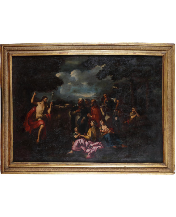 La predica del Battista, con antica cornice. Pier Francesco Cittadini è un artista milanese che si formò dapprima con Daniele Crespi (1598-1630) e poi con Guido Reni (1575-1642) a Bologna, dove soggiornò nel 1634 per poi trasferirvisi stabilmente nel 1650. Cittadini seppe indagare gran parte dei generi pittorici, distinguendosi come specialista nel ritratto, nella natura morta e nel paesaggio. Le sue storielle, disseminate di numerose figure dalla marcata gestualità, si ambientano sempre in paesaggi con quinte arboree. A più riprese, Cittadini tratta nella sua produzione pittorica le storie del Battista, come il Battesimo e la Predica