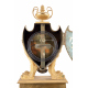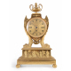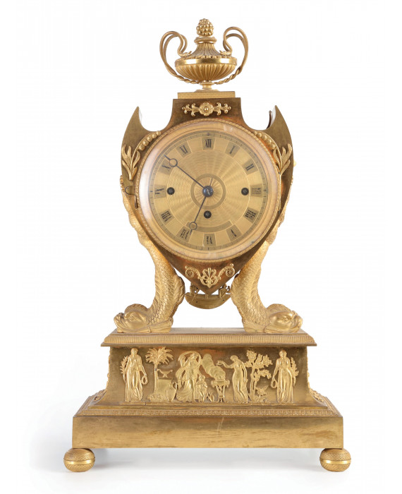 Elegante orologio da tavolo in bronzo dorato, cassa a forma di scudo sorretta da quattro delfini, base con fascia lavorata con scene classiche poggiante su quattro peducci a sfera, pendolo a forma di barca, quadrante guillochè con numeri romani, pomolo superiore a vaso. Vienna, periodo Biedermeir, circa 1820. cm42x26x15