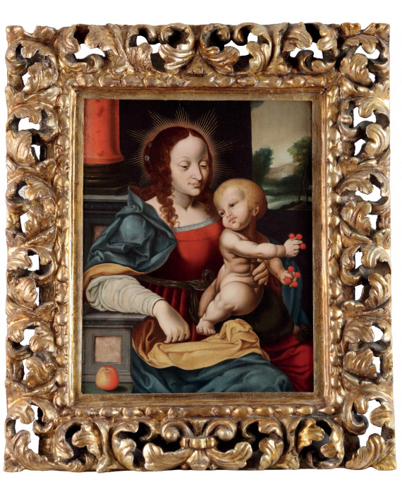 Madonna delle ciliegie, con cornice. L’opera esposta è da mettere in relazione con una delle più note opere di Joos van Cleve, la Madonna delle Ciliegie (Aachen, Suermondt-Ludwig-Museum), della quale furono prodotte e diffuse in tutto il Nord Europa numerose repliche, con o senza varianti, eseguite dall’ampio entourage di pittori che gravitavano intorno al maestro. La composizione, tuttavia, ha origine in Italia da un prototipo perduto di Leonardo da Vinci, eseguito probabilmente durante il suo secondo soggiorno milanese (1508-1513), di cui conosciamo una replica attualmente in collezione privata, realizzata da uno dei suoi migliori allievi, Giampietrino (Attivo a Milano, 1495-1540). Si ipotizza quindi che van Clevee possa aver conosciuto il prototipo leonardesco durante il suo soggiorno in Italia negli anni Venti o in un successivo viaggio in Francia nel 1528, poiché una fonte riferisce che il dipinto di Leonardo fu trasferito in Francia dal governatore di Milano Charles d'Amboise. È tuttavia più verosimile che van Cleve si sia ispirato a una delle copie eseguite dai seguaci del maestro toscano. Numerose versioni di questo prototipo, eseguite dai diversi seguaci del van Cleve, sono note, e circa una decina di queste sono state proposte dalla critica come opere eseguite dalla sua bottega più stretta.