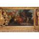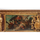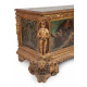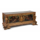 Importante e rara cassapanca eclettica con piano e laterali dipinti nei toni del verde con serti vegetali e profilo classico centrale, fronte finemente dipinto con scene tratte dalla vita di Enea, intervallate da stemma araldico centrale con cimiero in legno dorato ed intagliato, paraste laterali con soldati in armatura con spade in ferro, poggianti su leoni sdraiati, fascia inferiore riccamente intagliata con serti di frutta. Firenze, sec. XIX. cm67x176x64 (piccola mancanza, cadute di colore, difetti al piano e usure del tempo)