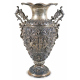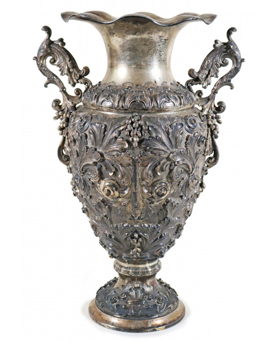 Monumentale vaso biansato in argento 800 interamente sbalzato con volute vegetali, collo liscio con bugnature. Alt. cm55. Peso gr. 5060